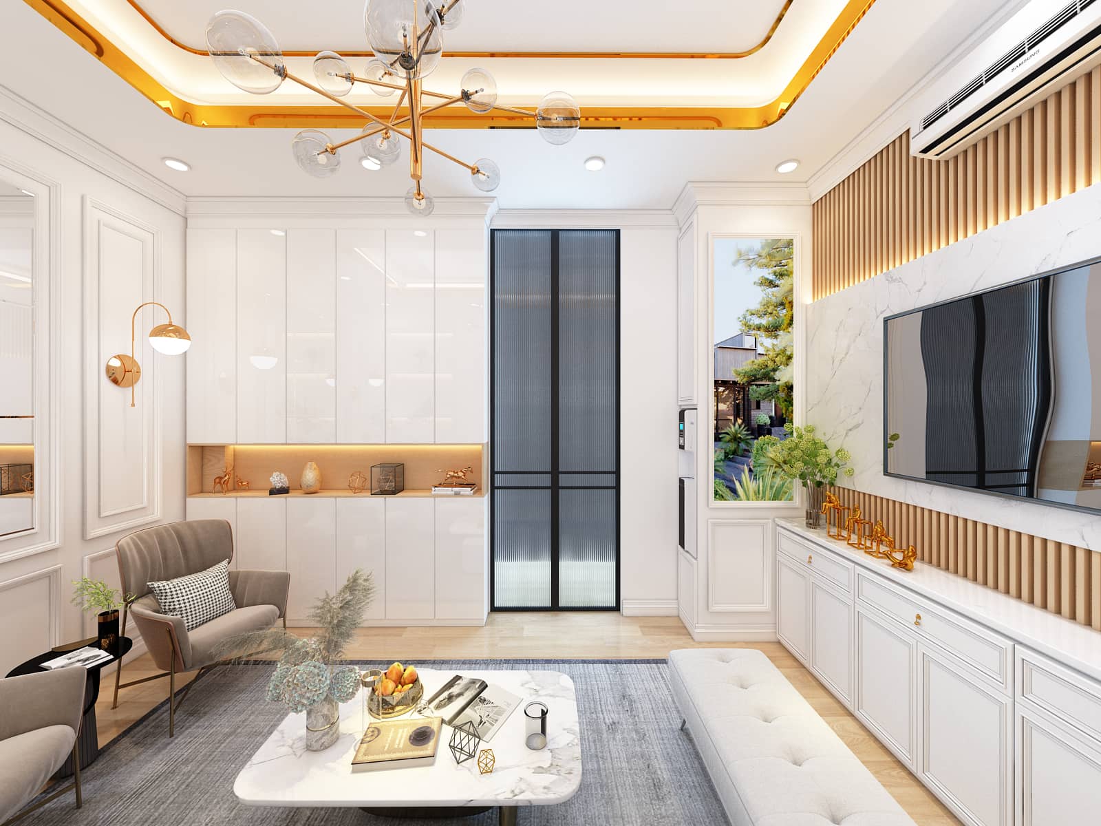 Không gian sử dụng tông màu nhẹ nhàng như trắng kem, be sáng, kết hợp với điểm nhấn gỗ và ánh sáng dịu nhẹ từ hệ đèn LED gián tiếp – tạo nên hiệu ứng thị giác mềm mại, thanh lịch và tinh tế.